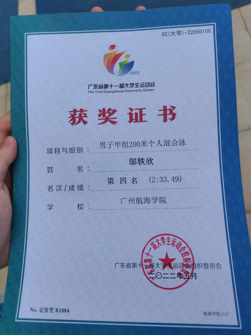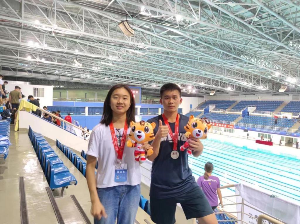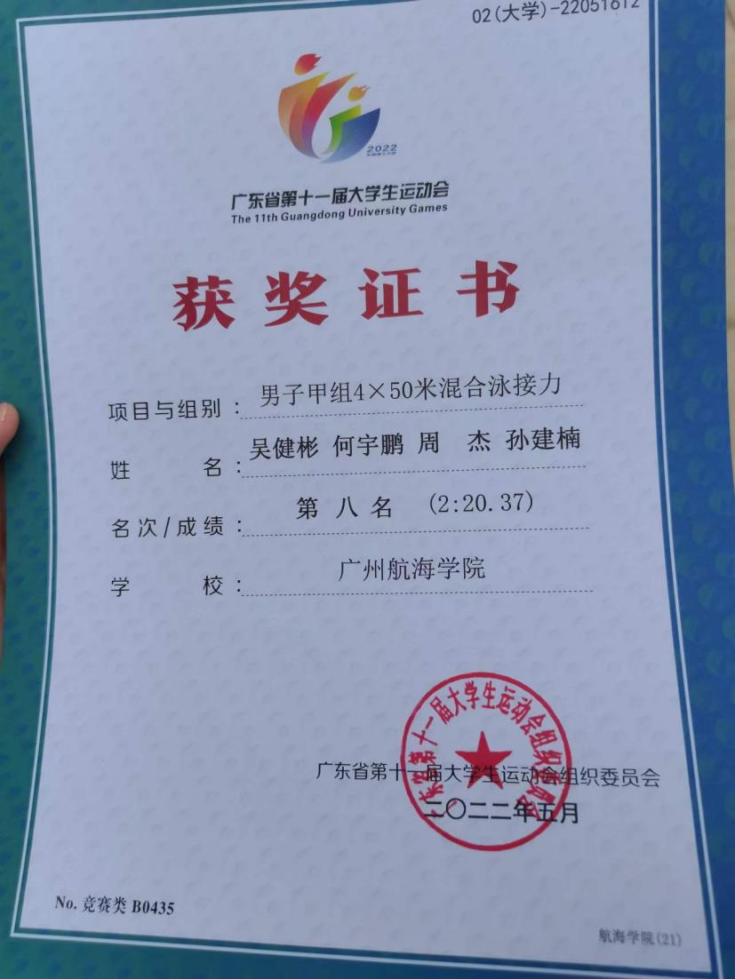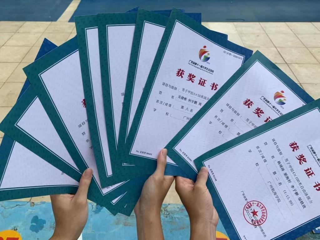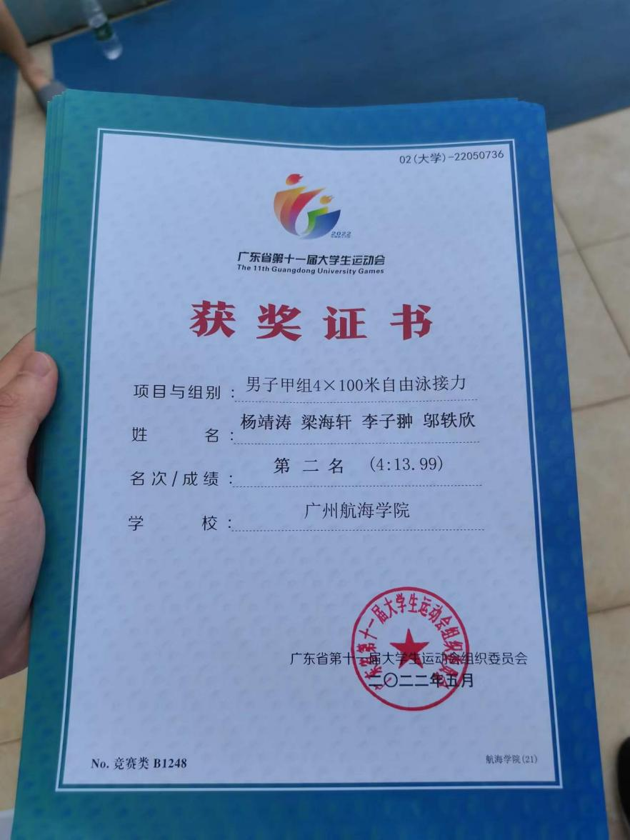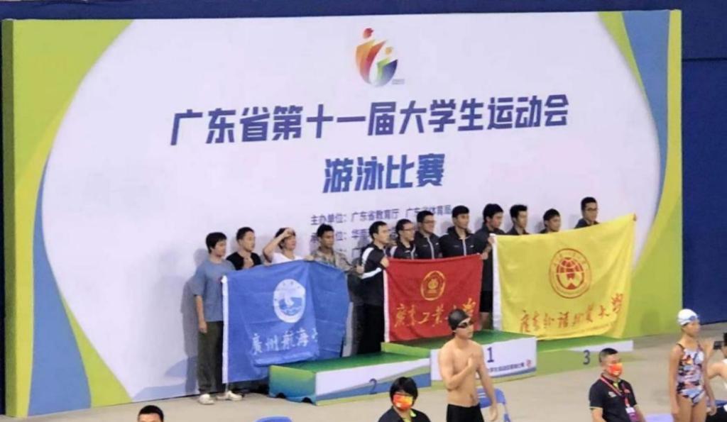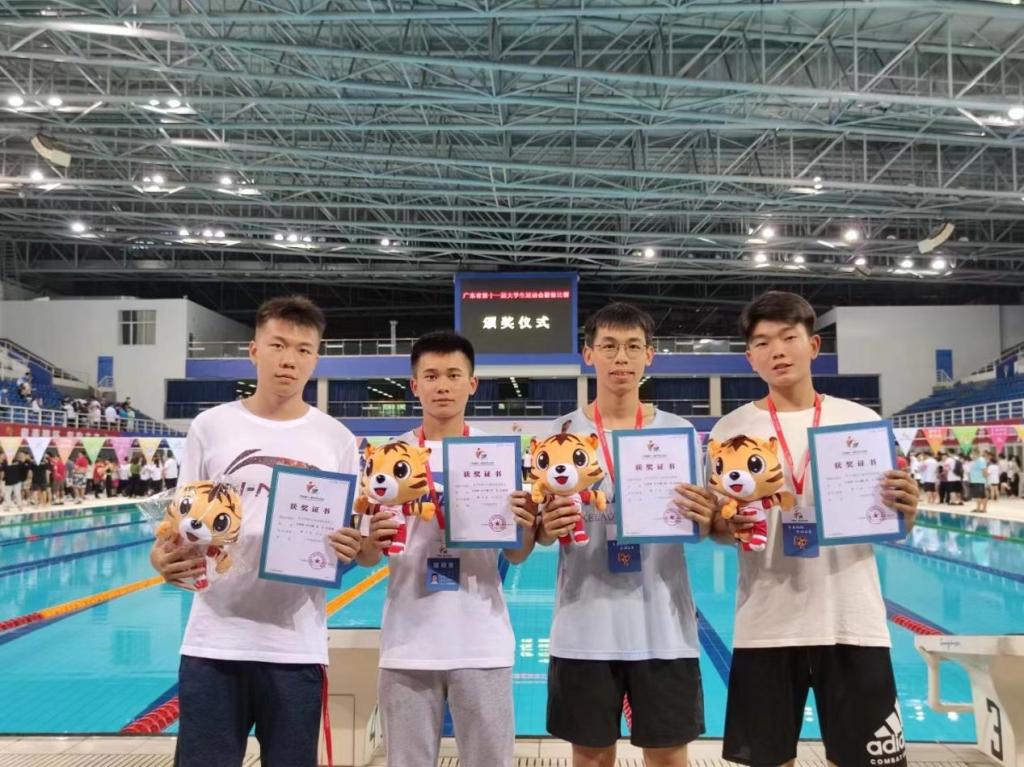 (公共体育教学部供稿)5月24日至29日,广东省第十一届大学生运动会游泳项目比赛在广州奥林匹克体育中心游泳馆举行,我校游泳队在公共体育教学部古志金老师和麦健民老师的带领下不畏强手,奋勇拼搏,取得了我校参加广东省大学生运动会游泳项目比赛以来的最好成绩:邬轶欣、梁海轩、李子翀、杨靖涛同学获得甲组男子4×100米自由泳接力第二名(4分13秒99),邬轶欣同学获得甲组男子200米混合泳第四名(2分33秒49),周杰、吴健彬、何宇鹏、孙建楠同学获得甲组男子4×50米混合泳接力第八名(2分20秒37)。