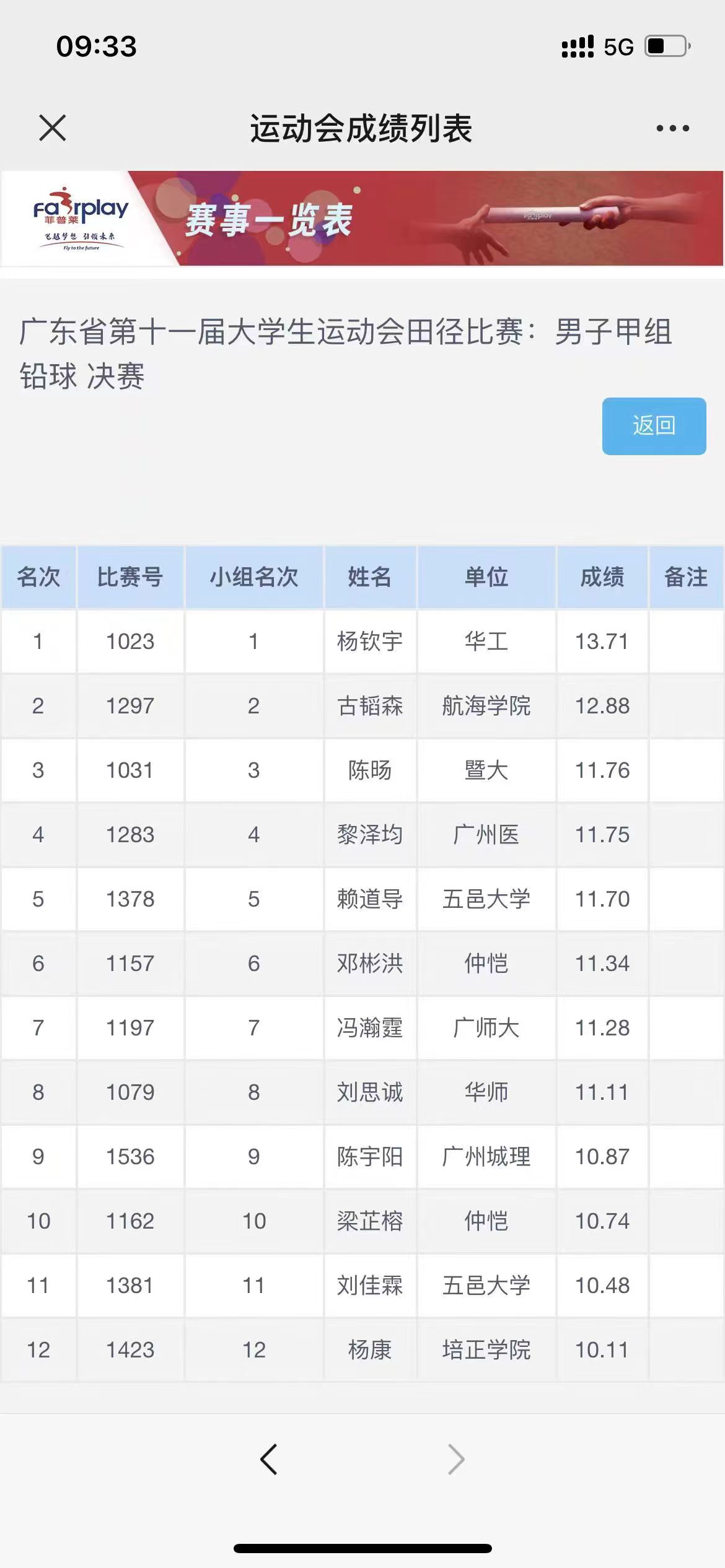 (公共体育教学部供稿)第十一届广东省大学生运动会田径比赛于6月18日在华南理工大学(五山校区)运动场火热开赛。在6月22日上午举行的男子铅球比赛中,我校运动员—信通学院20级软件工程专业古韬森同学,以12.88米的个人最好成绩,荣获大运会男子铅球第二名。