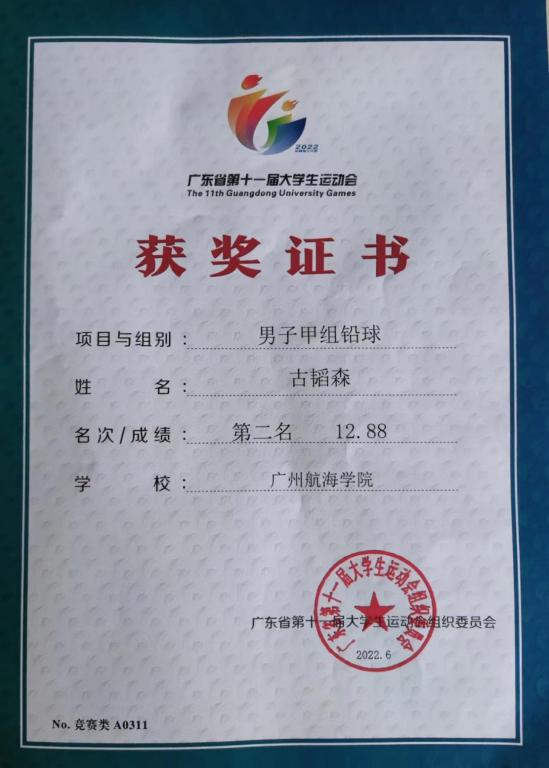 经过前期的认真准备、刻苦训练,我校运动员在赛场上奋力拼搏、发挥稳定,赛出了水平,赛出了风格。特别是男子铅球运动员古韬森(左一),在决赛中,顶住压力,沉着冷静,最终以12.88m的傲人成绩再次打破由自己去年在校运会上创造的纪录11米)夺得亚军。洪建敏、李东阳创造了自己项目的个人最好成绩