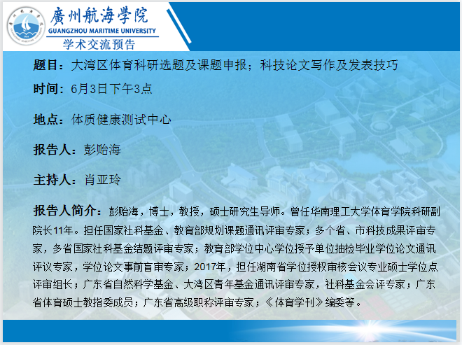 彭贻海教授讲座预告:大湾区体育科研选题及课题申报;科技论文写作及发表技巧