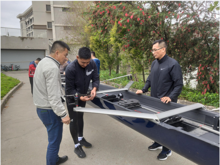 上午,张国林教练随同4名场馆管理员到海运学院对赛艇及配件进行了评估和清点,办理了移交手续,随后,组织人马把赛艇搬运到北区人工湖旁;并对管理员详细讲解了赛艇的构造、搬运和安装使用,日常保养的相关知识与注意事项。