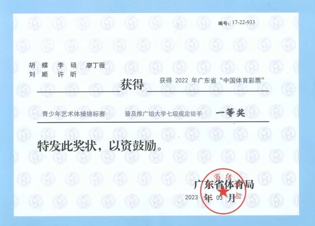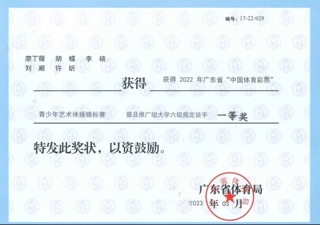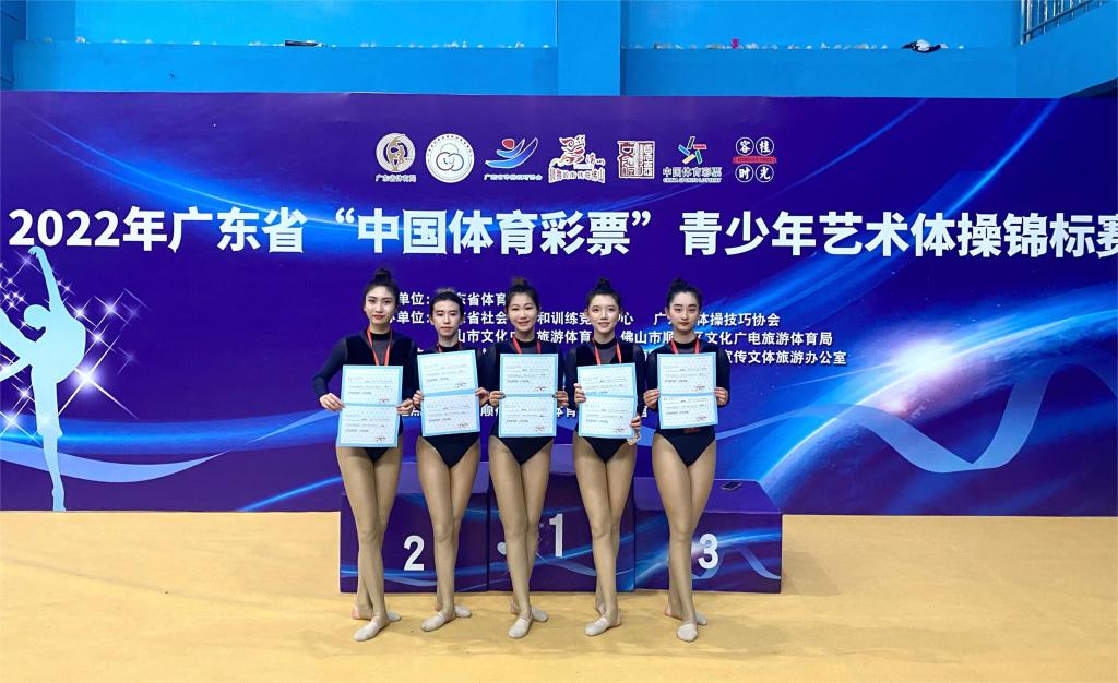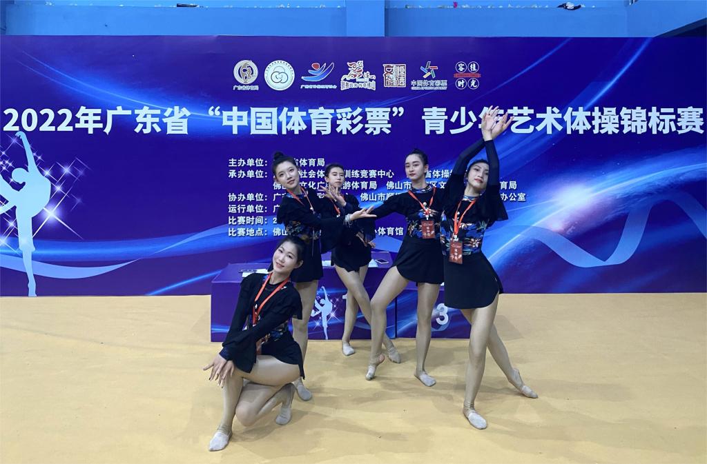 (公共体育教学部供稿)因疫情延期举办的2022年广东省青少年艺术体操锦标赛于2023年2月28日在佛山顺德容桂体育中心开幕,比赛共持续4天。我校艺术体操代表队在教练员李冰老师的带领下参加了大学组6级规定项目、7级规定项目的比赛,荣获了2个一等奖。