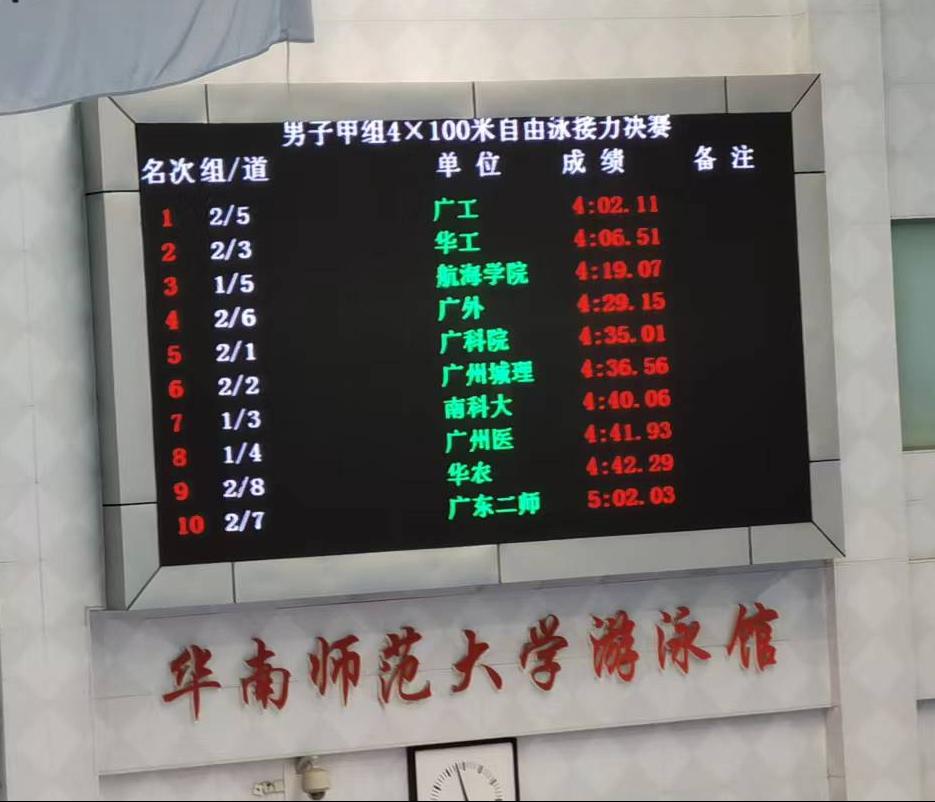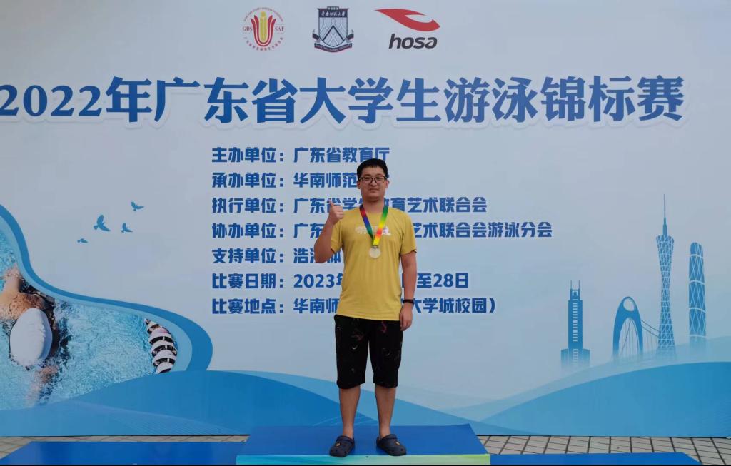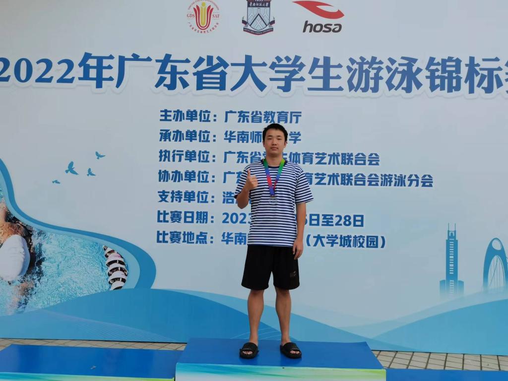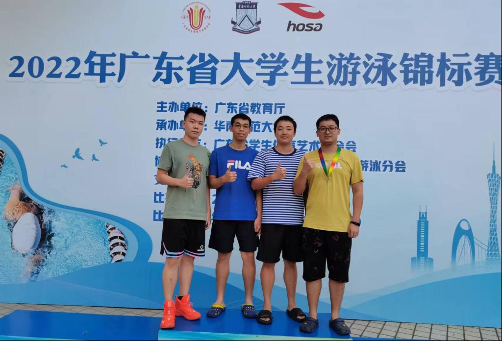(公共体育教学部供稿)因疫情延迟的2022年广东省大学生游泳锦标赛于2023年5月26日至28日在华南师范大学(大学城校区)举行,我校游泳队在领队麦建民老师和教练古志金老师的带领下,共11名运动员参加了大学生甲组11个项目的比赛,获得男子4×100米自由泳接力第三名、男子200米自由泳第四名、男子100米自由泳第六名,来自海运学院的邬轶欣同学一人独得三奖,可喜可贺!