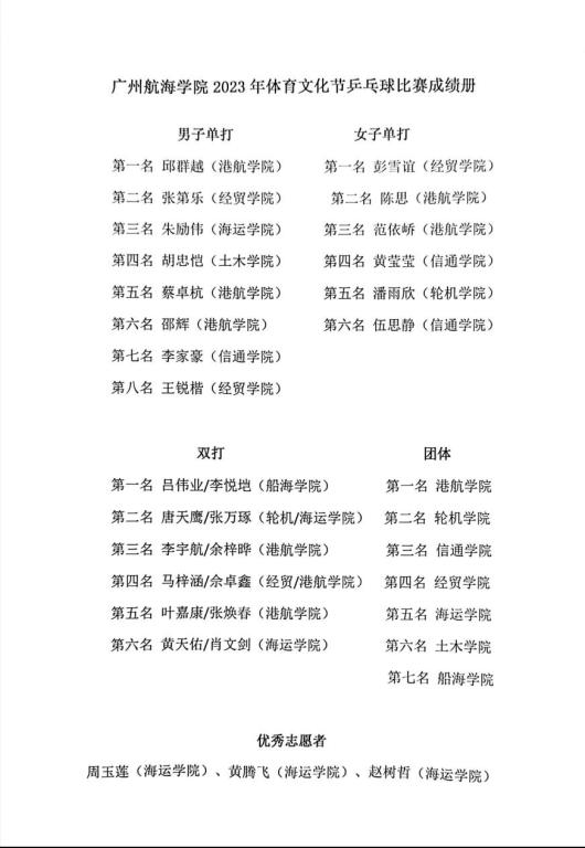 (公共体育教学部供稿)5月27日至28日,2023年体育文化节学生乒乓球赛在我校黄埔校区举行。本次比赛设置了团体赛和单项赛,其中单项赛包括男单、女单和双打三项。经过两天紧张的比赛,港航学院队获团体第1名,港航学院的邱群越获男子单打第1名,经贸学院的彭雪谊获女子单打第1名,船海学院的吕伟业、李悦垲获双打第1名。