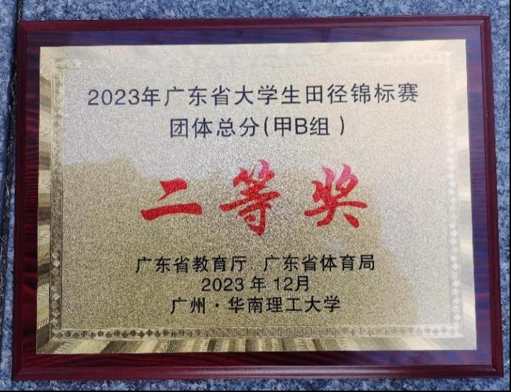 (公共体育教学部供稿)(公共体育教学部)11月30日至12月3日,2023年广东省大学生田径锦标赛在华南理工大学(五山校区)举行,本次比赛由广东省教育厅指导,广东省学生体育艺术联合会主办,共有全省122所高校,2129名运动员参赛,其中甲组共有54所高校,参赛运动员506人。今年我校田径队选派了10名(7男、3女)运动员参赛,在教练员蔡华老师的精心指导下,经过全体运动员的顽强拼搏,多点开花,收获硕果:陈政达同学勇夺男子三级跳远冠军和跳远第四名,古韬森同学夺得男子铅球冠军,其他运动员还斩获了男子110米栏、女子400米栏2个第四名,女子标枪、男子铅球2个第六名、男子5000米长跑第七名,男子铁饼第八名,终获团体总分二等奖!这是我校田径队自2013年升本参加广东省大学生田径锦标赛甲组比赛以来,取得的最好成绩,特别是首次荣获男子铅球、男子三级跳远2项冠军,实属不易,为学校争光添彩!