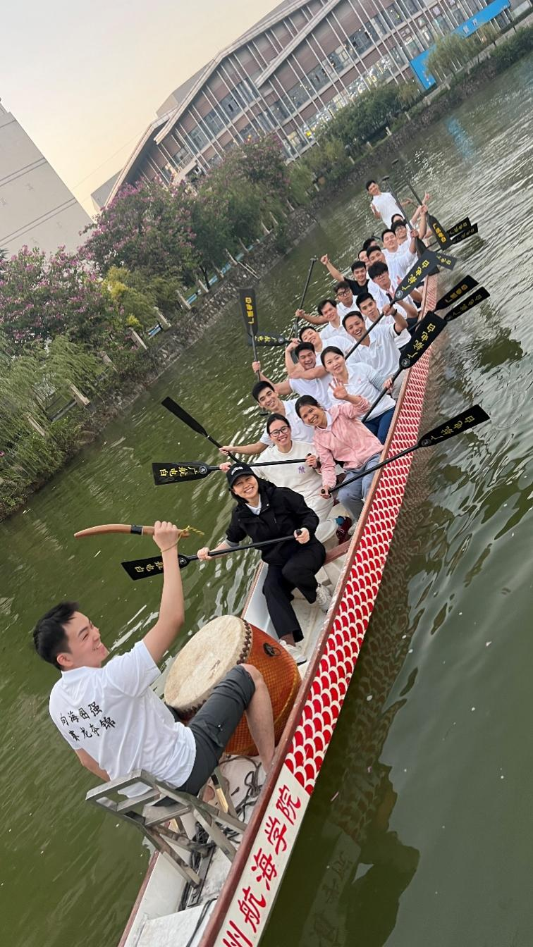 交流结束后,龙舟队员们再次在学校北区湖边码头集结,大家身着统一的队服,登上龙舟,脸上洋溢着喜悦和期待,手握船桨,眼神坚定,仿佛回到了当年的赛场。随着队长一声令下,龙舟如同离弦之箭,划破湖面,激起层层浪花,桨声伴随着口号声,在湖面上回荡,岸边的师生纷纷为这支充满活力的队伍加油鼓劲,现场气氛热烈。