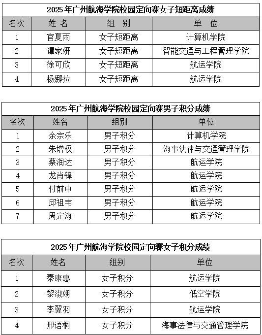 比赛当天,各组选手齐心协力,在校园中寻找各个打卡点,并充分运用智慧和体力,完成相应任务。 参赛同学纷纷表示,定向越野比赛既要靠体力比速度,更要靠智力选最佳路线,既考验选手对校园环境的熟悉程度,又挑战其观察力与应变能力,整个赛程充满了探索与挑战的乐趣。经过激烈的角逐,最终比赛成绩如下:
