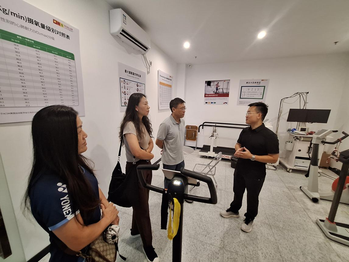 在小元健康产业管理有限公司,总经理张宏与体育学院党总支书记王峰、支委马宝壮、熊庆霞、教工第2党支部书记李冰等进行了交流并一起参观、体验了健身设施,在交流座谈中,张宏对公司的业务工作范围以及特色亮点等作了介绍,体育学院一行就业务发展契合点提出了相关工作思路,参加交流的同志表示,高校智能化健身馆建设和运营,以及相关信息化技术的配套使用,能更好帮助大学生掌握科学的健身技能,让每一位大学生享受到健康生活带来的快乐。
