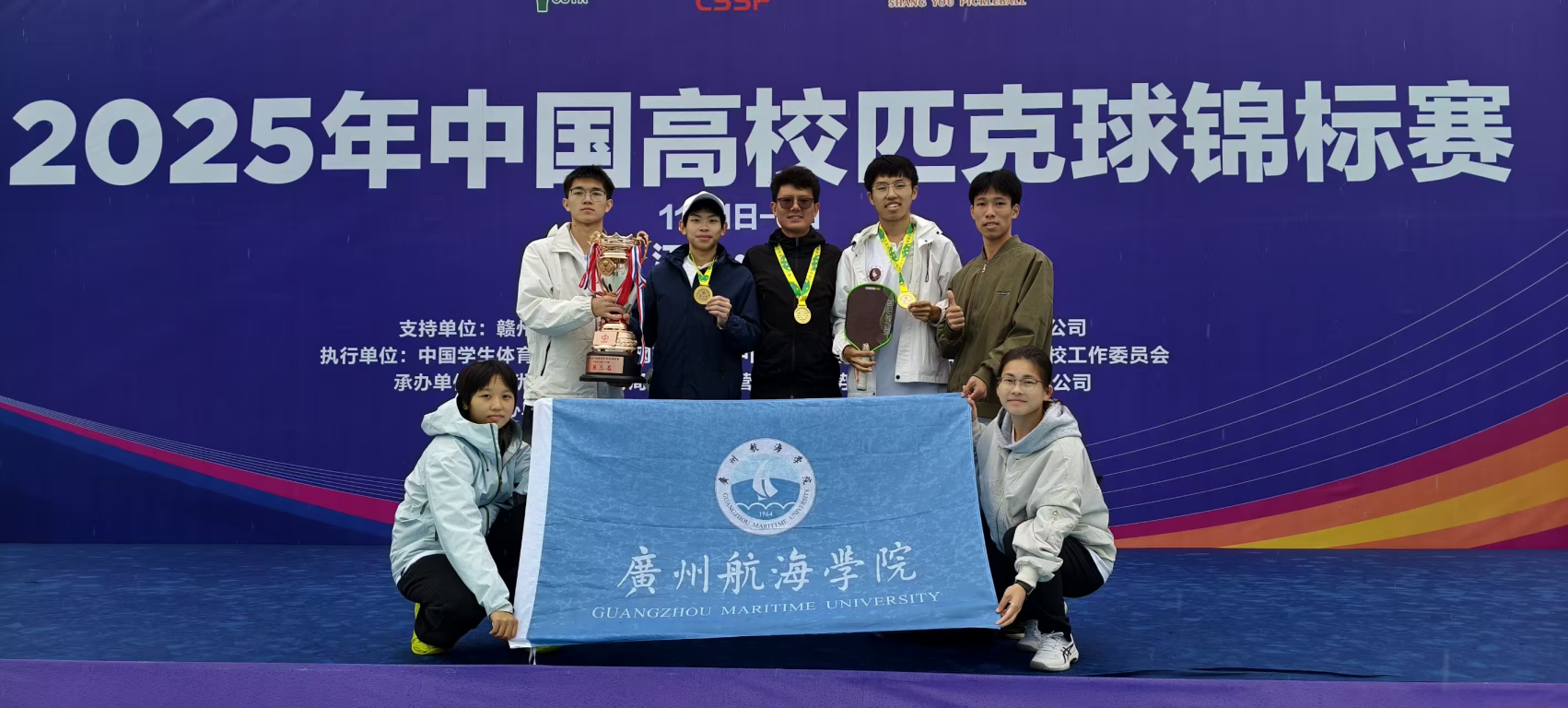 作为习近平总书记复信美国马里兰州青少年匹克球队访华团后,国内规模最大的高校匹克球赛事,本次比赛吸引了102所高校1000余名运动员报名参赛。我校代表队由6名运动员组成,在教练邵春平、领队洪熙尧两位老师的带领下,凭借精湛的球技和出色的团队配合,经过五天激烈角逐,一路过关斩将收获佳绩,其中,张文通勇夺男子单打冠军,张文通、吴镇涛组合赢得男子双打冠军,黄广林、伍乐宜组合获得混合双打第五名。