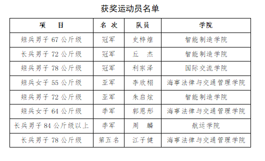 除金牌得主外,其他队员同样表现亮眼。李欣栩在女子55公斤级短兵项目中,顶住压力一路冲进决赛,虽最终不敌对手获得银牌,但其赛场上展现的坚韧意志赢得全场掌声;朱启炫在男子72公斤级短兵比赛中,顶着40度高烧迎战,凭借坚强的毅力与出色的技战术发挥,斩获银牌;郭恩彤、周麟分别在女子64公斤级短兵、男子84公斤级以上长兵项目中摘得铜牌;海事法律与交通管理学院江子健也在男子78公斤级长兵项目中获得第五名,为团队总分贡献力量。