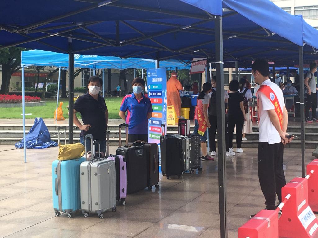 上午7点30分,大家以小组为单位,根据任务分配,在各自岗位行动起来。公体部领导班子模范带头,靠前指挥靠前服务,在学校门口疏通交通、引导学生进校。其他成员,有的给学生家长支休息的帐篷,搬凳子,有的在各二级学院办事地点维持秩序,有的负责引导毕业生来到核酸测试地点完成检测或引导他们到达所在学院的报到点,有的专一负责整理与照看毕业生行李箱。整个上午,大家都在忙碌中,学生有需要的,志愿者们都会全力帮助。下午2点整,所有成员准时到岗。由于天气炎热,考虑到毕业生大件行李较多,搬运不便、宿舍离校门或车站远等困难,为减少学生离校奔波辛苦,党员志愿服务者刘付区老师、王浩老师、洪熙尧老师在肖亚玲书记的带领下亲自驾车来到学生宿舍楼下,为他们搬运行李,一直往返于学生宿舍与校门口、地铁口之间;陈伟聪老师、刘思润、周智权、阙永伟老师一直忙于为毕业生搬运行李的校中巴车上。大家一直干到晚上7点半钟。教工志愿者用真诚、微笑与汗水热情地服务每位返校学生,为他们排忧解难,形成一道亮丽的风景线。学生们看到这一幕十分感动。