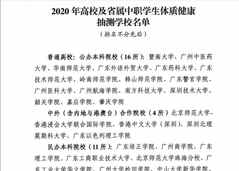 (公共体育教学部供稿)广东省教育厅将于10-12月开展2020年学生体质健康水平抽测工作,我校在60所被抽中的普通高校行列。10月11-12日,我校《国家学生体质健康标准测试》中心贺泽江主任和刘巧老师参加了在华南师范大学召开的2020年广东省学生体质健康测试工作培训会议。